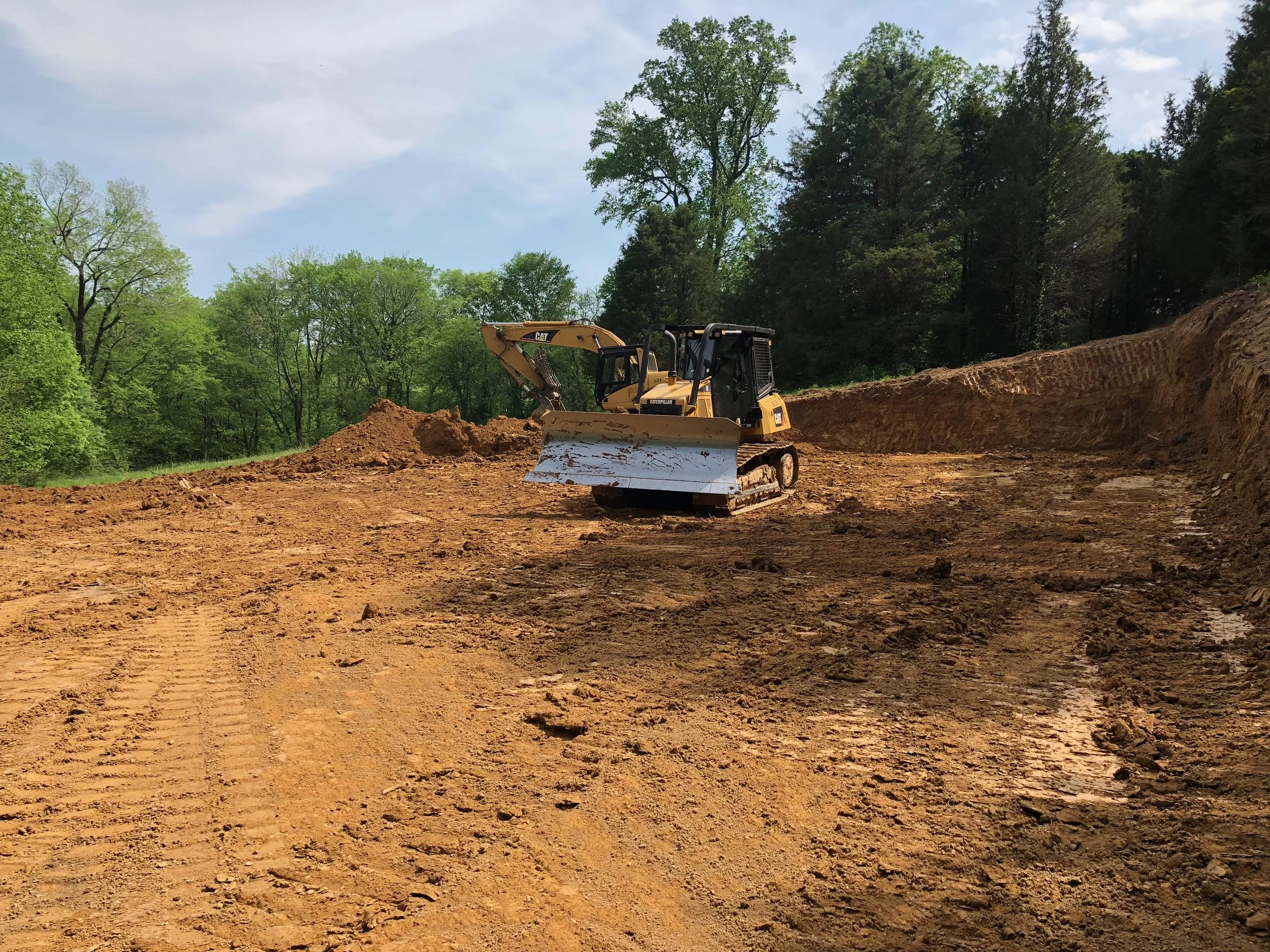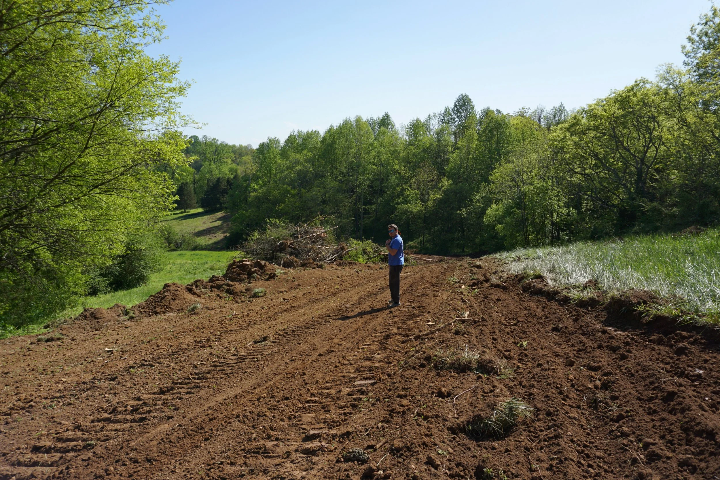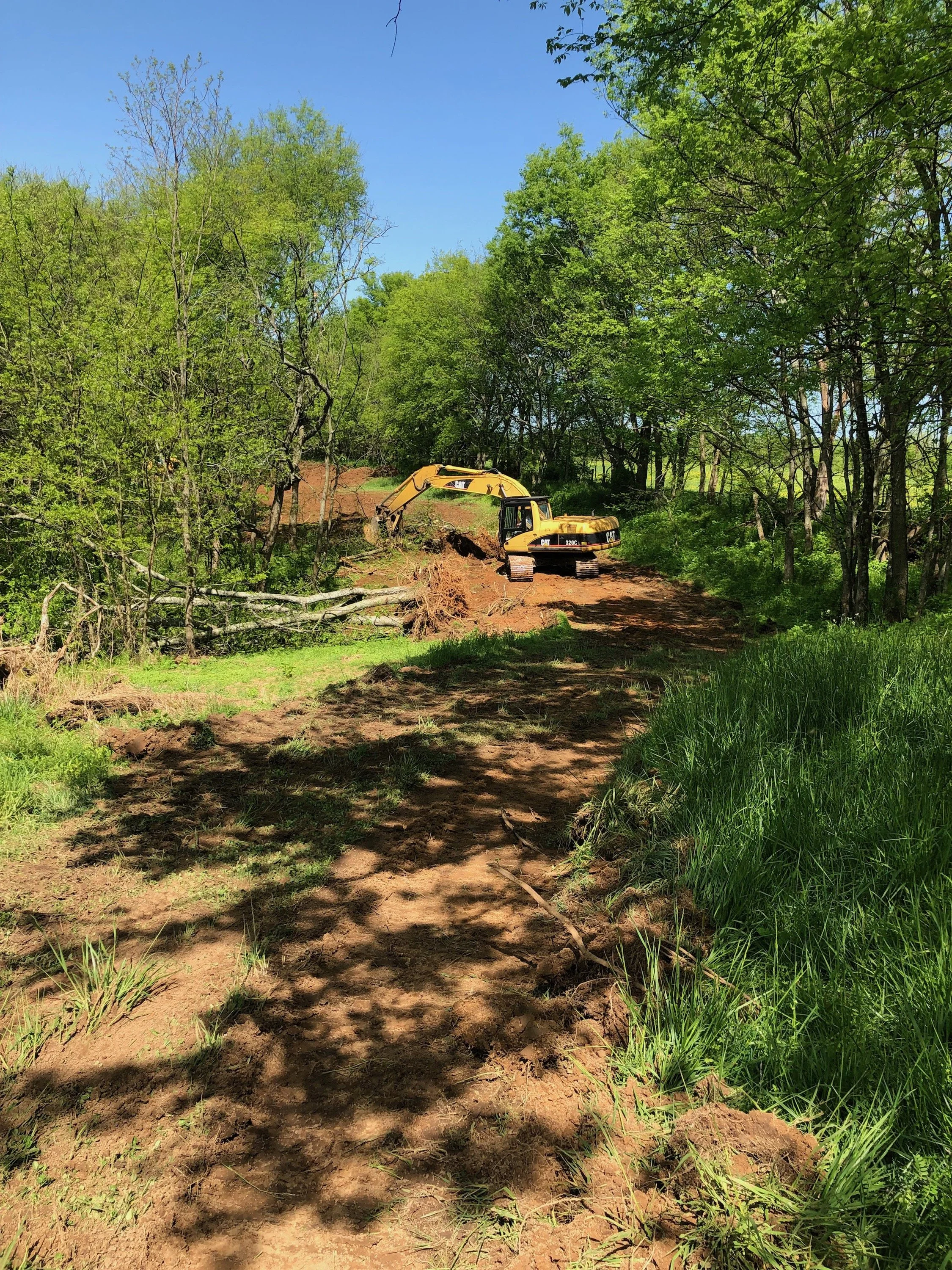 We had to start the process by putting in a road down to the house site. We originally thought we would just put a road in straight down the hillside but our excavator suggested we curve it down to cross the stream and cut in to an existing old road that would lead straight up to the house - and we are so glad we did! Now our house sits perfectly when you drive up to our house.